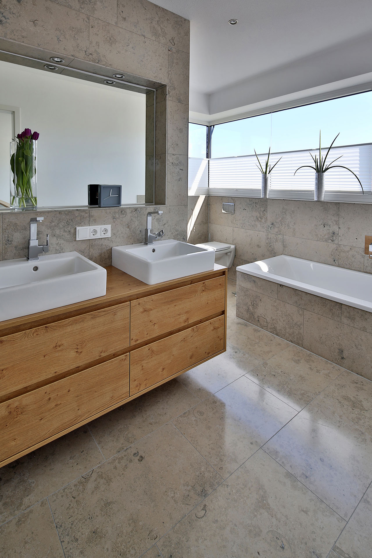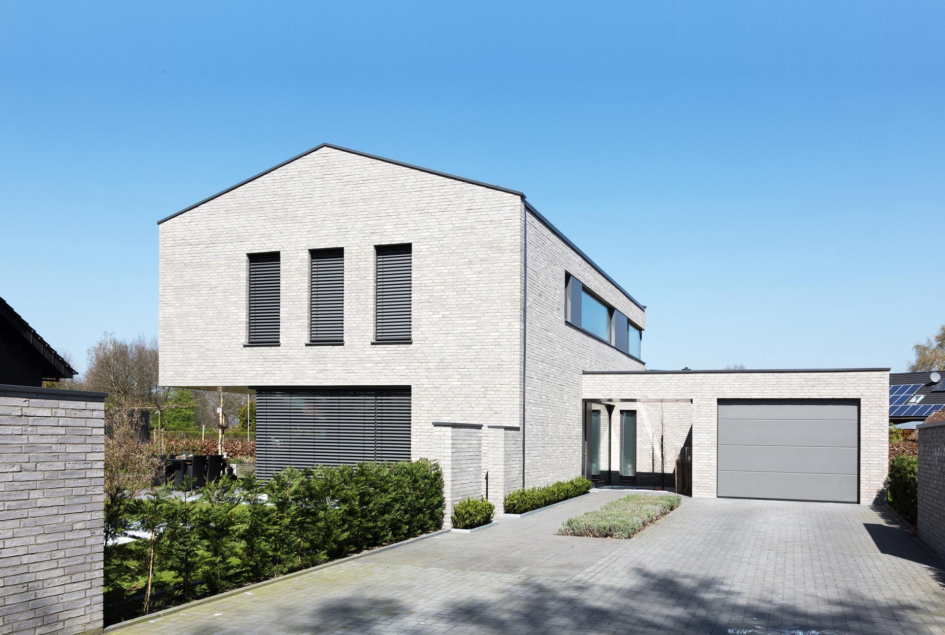 Die Fassade aus hellem Wasserstrichklinker im wilden Verband trifft auf große Glasflächen, die Innenräume werden geprägt von Naturstein, hellem Weiß und warmem Holz – ein Zusammenspiel, das moderne Architektur mit wohnlicher Wärme verbindet.