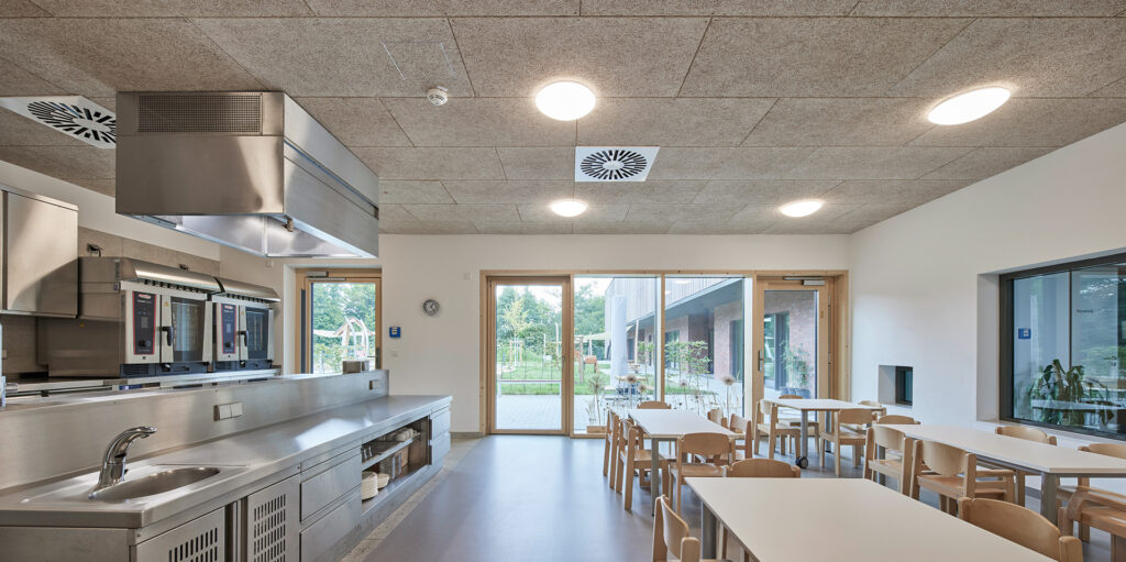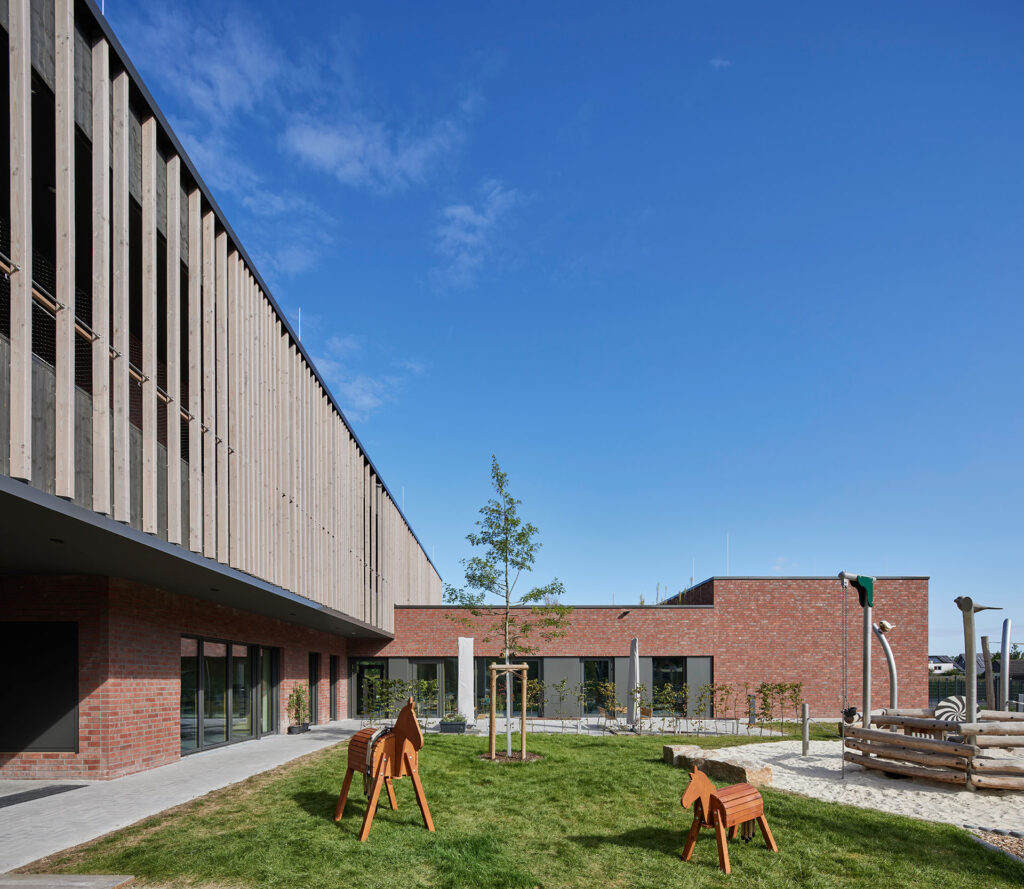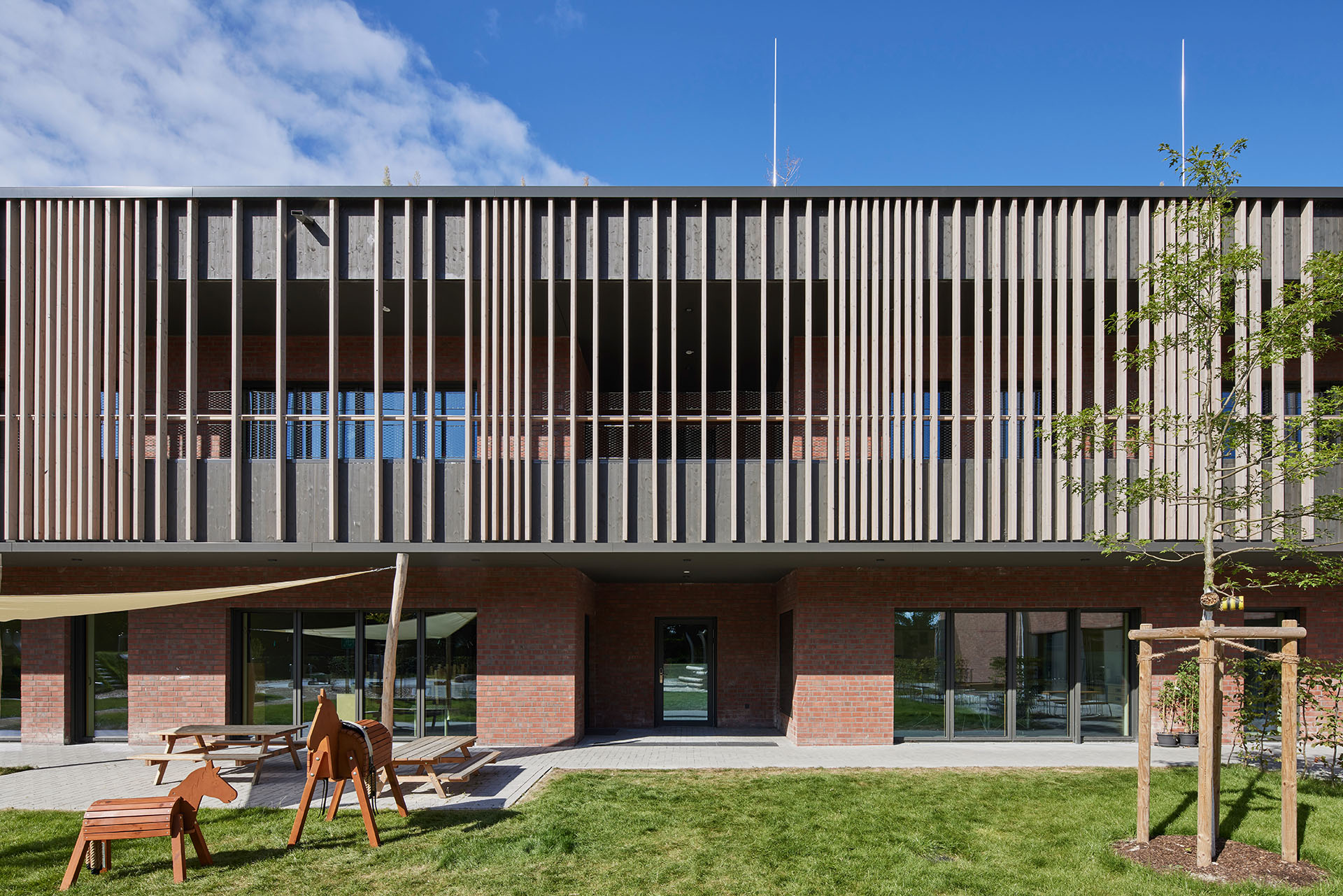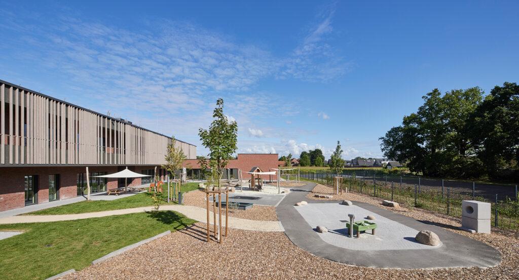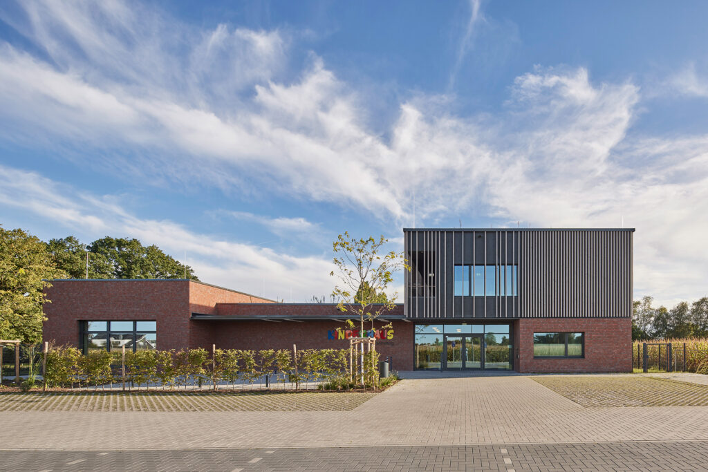 Die dritte eigene Kindertageseinrichtung der Stadt Emsdetten ist der erste in Betrieb genommene Baustein im Neubaugebiet „Silberweg“ und tritt als „Landmark“ in Erscheinung. Besonderer Fokus liegt auf einer klimaverträglichen Bauweise: KfW-Standard, PV-Anlage, Luft-Wasser-Wärmepumpe, Dachbegrünung, Holzfassade und Holzfenster; künstliche Baustoffe werden bei diesem Bauvorhaben weitgehend vermieden. Der Baukörper der Kita ist L-förmig angelegt. Der zweigeschossige, längliche Gebäudeteil nimmt fünf Gruppenräume, das Eingangsfoyer sowie die Mitarbeiterräume auf. Über Eck schließt ein eingeschossiger, kürzerer Baukörper an, der Sondernutzungen beherbergt und bei Bedarf unabhängig vom Kitabetrieb genutzt werden kann. Das äußere Erscheinungsbild wird in reduzierter Form durch zwei Hauptmaterialien geprägt: ein Verblendmauerwerk im Erdgeschoss und eine vorgehängte Holzfassade im Obergeschoss. Das Gebäude teilt das Grundstück in einen nördlichen Verkehrsbereich und ein separates Spiel- und Außengelände. Im Verkehrsbereich entstehen PKW-Stellplätze sowie eine getrennt erschlossene, überdachte Fahrradabstellanlage auch nutzbar für Lastenräder. Rasengittersteine in der Kiss-&-Ride-Zone und im Wendebereich reduzieren die Versiegelung der Grundstücksfläche. Ebenso wie das Gebäudeinnere, ist die großzügige Spielfreifläche inklusiv gestaltet, durch den Baukörper geschützt und soll allen Kindern – unabhängig von Einschränkungen – eine eigenständige Nutzung ermöglichen.