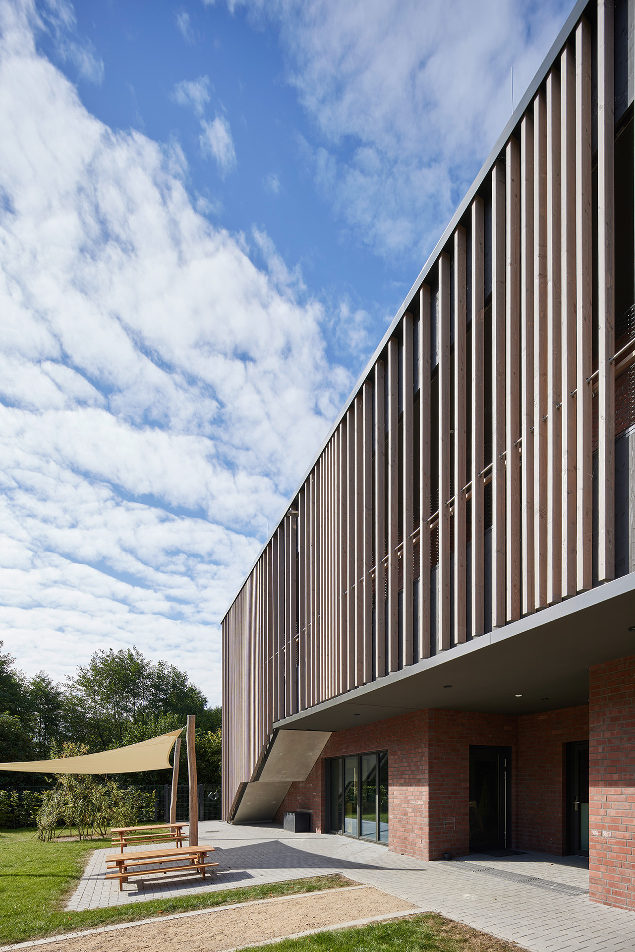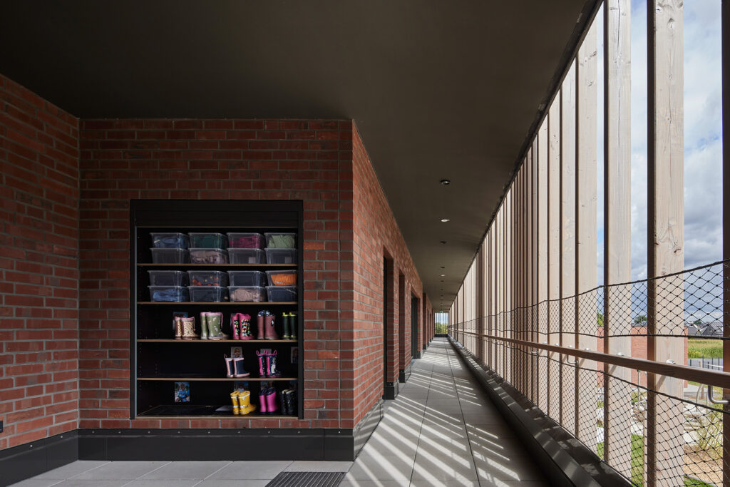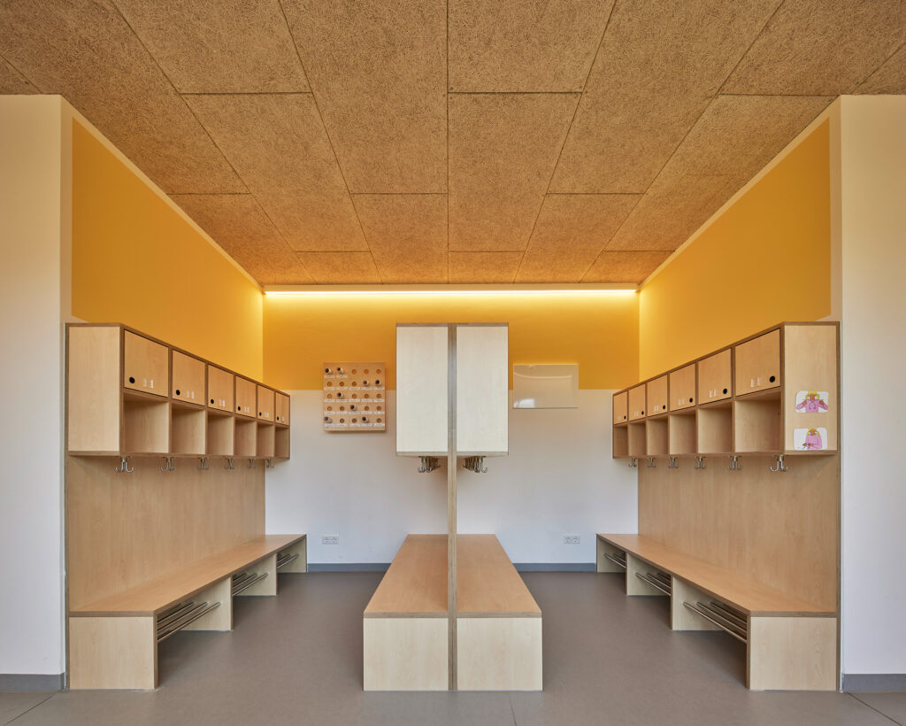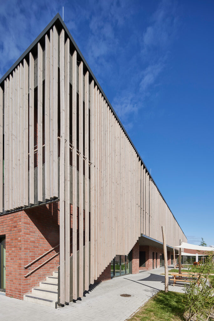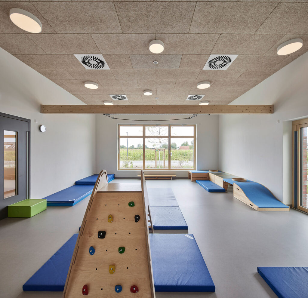 Die dritte eigene Kindertageseinrichtung der Stadt Emsdetten ist der erste in Betrieb genommene Baustein im Neubaugebiet „Silberweg“ und tritt als „Landmark“ in Erscheinung. Besonderer Fokus liegt auf einer klimaverträglichen Bauweise: KfW-Standard, PV-Anlage, Luft-Wasser-Wärmepumpe, Dachbegrünung, Holzfassade und Holzfenster; künstliche Baustoffe werden bei diesem Bauvorhaben weitgehend vermieden. Der Baukörper der Kita ist L-förmig angelegt. Der zweigeschossige, längliche Gebäudeteil nimmt fünf Gruppenräume, das Eingangsfoyer sowie die Mitarbeiterräume auf. Über Eck schließt ein eingeschossiger, kürzerer Baukörper an, der Sondernutzungen beherbergt und bei Bedarf unabhängig vom Kitabetrieb genutzt werden kann. Das äußere Erscheinungsbild wird in reduzierter Form durch zwei Hauptmaterialien geprägt: ein Verblendmauerwerk im Erdgeschoss und eine vorgehängte Holzfassade im Obergeschoss. Das Gebäude teilt das Grundstück in einen nördlichen Verkehrsbereich und ein separates Spiel- und Außengelände. Im Verkehrsbereich entstehen PKW-Stellplätze sowie eine getrennt erschlossene, überdachte Fahrradabstellanlage auch nutzbar für Lastenräder. Rasengittersteine in der Kiss-&-Ride-Zone und im Wendebereich reduzieren die Versiegelung der Grundstücksfläche. Ebenso wie das Gebäudeinnere, ist die großzügige Spielfreifläche inklusiv gestaltet, durch den Baukörper geschützt und soll allen Kindern – unabhängig von Einschränkungen – eine eigenständige Nutzung ermöglichen.