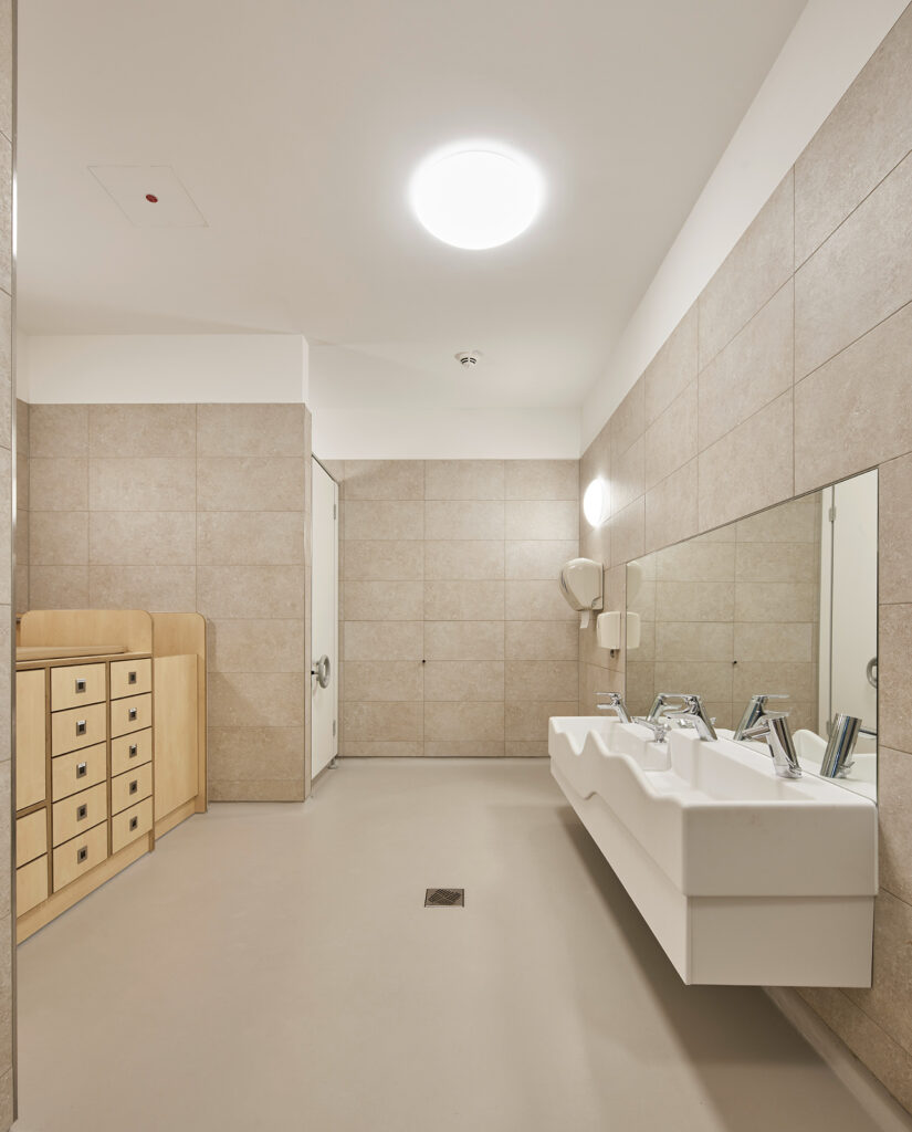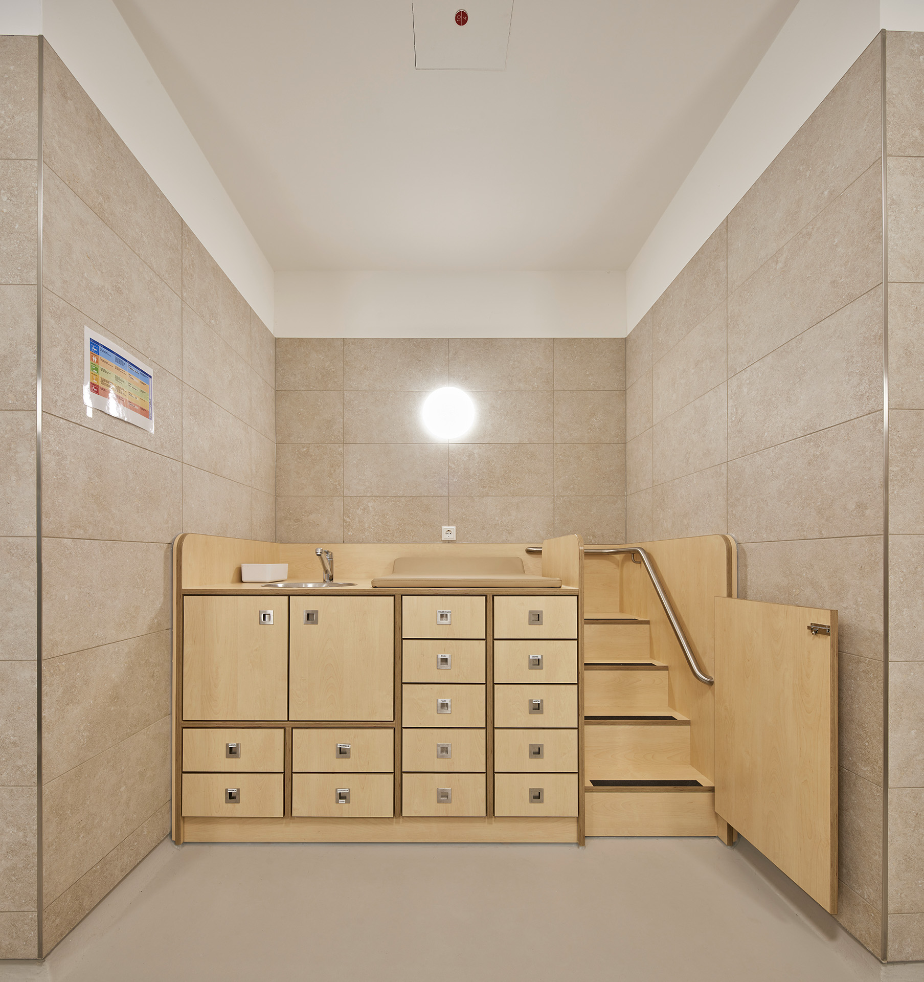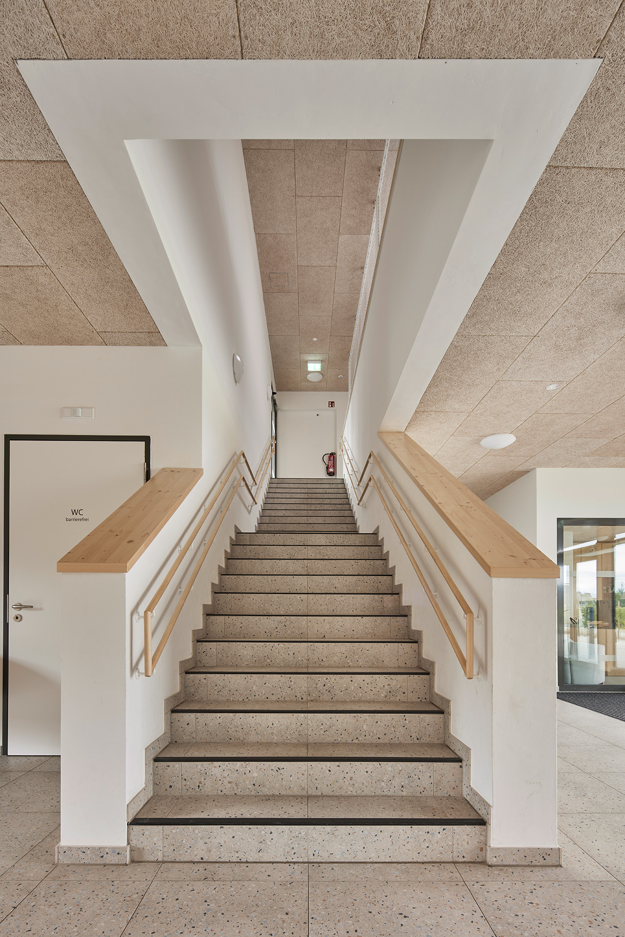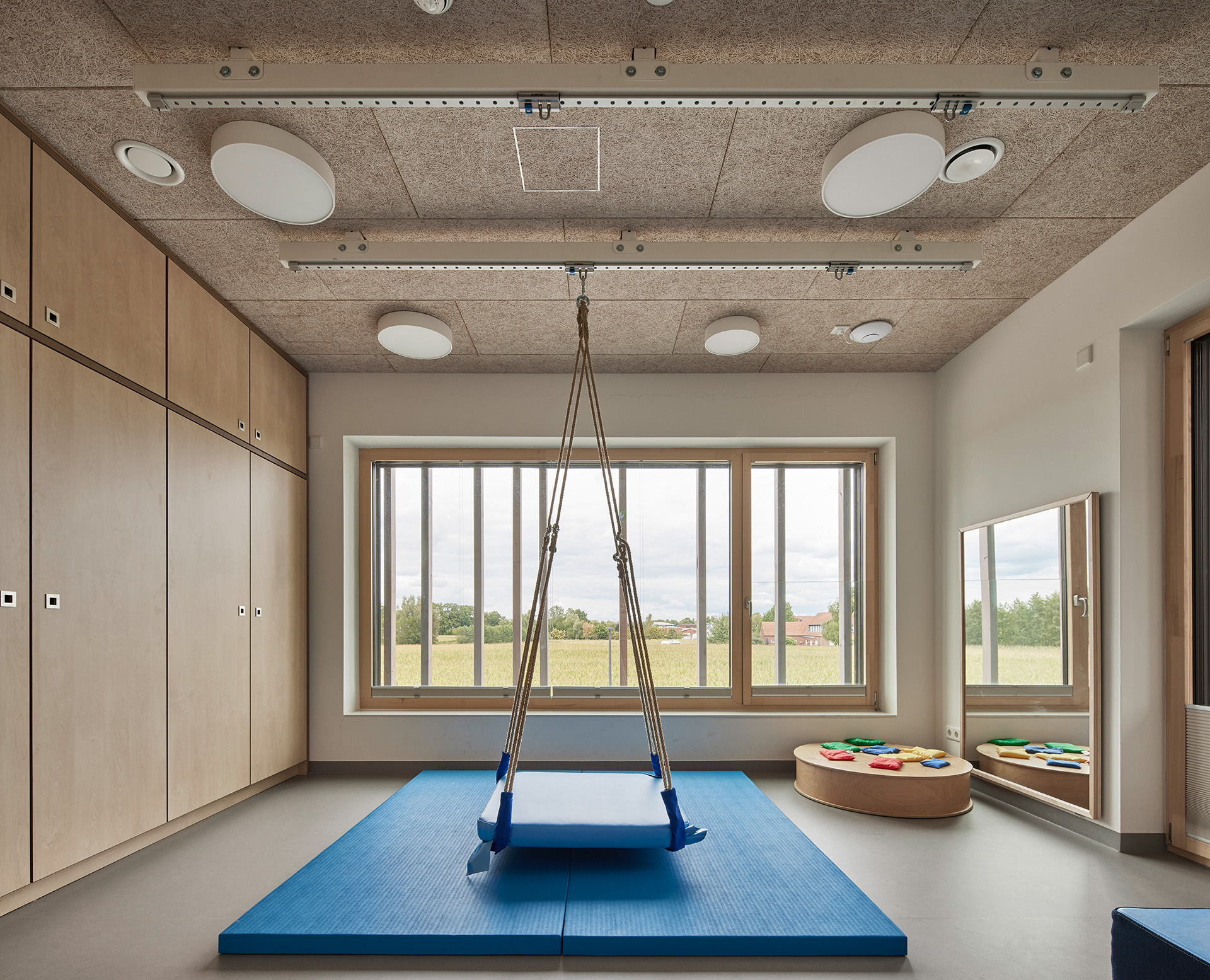 Die dritte eigene Kindertageseinrichtung der Stadt Emsdetten ist der erste in Betrieb genommene Baustein im Neubaugebiet „Silberweg“ und tritt als „Landmark“ in Erscheinung. Besonderer Fokus liegt auf einer klimaverträglichen Bauweise: KfW-Standard, PV-Anlage, Luft-Wasser-Wärmepumpe, Dachbegrünung, Holzfassade und Holzfenster; künstliche Baustoffe werden bei diesem Bauvorhaben weitgehend vermieden. Der Baukörper der Kita ist L-förmig angelegt. Der zweigeschossige, längliche Gebäudeteil nimmt fünf Gruppenräume, das Eingangsfoyer sowie die Mitarbeiterräume auf. Über Eck schließt ein eingeschossiger, kürzerer Baukörper an, der Sondernutzungen beherbergt und bei Bedarf unabhängig vom Kitabetrieb genutzt werden kann. Das äußere Erscheinungsbild wird in reduzierter Form durch zwei Hauptmaterialien geprägt: ein Verblendmauerwerk im Erdgeschoss und eine vorgehängte Holzfassade im Obergeschoss. Das Gebäude teilt das Grundstück in einen nördlichen Verkehrsbereich und ein separates Spiel- und Außengelände. Im Verkehrsbereich entstehen PKW-Stellplätze sowie eine getrennt erschlossene, überdachte Fahrradabstellanlage auch nutzbar für Lastenräder. Rasengittersteine in der Kiss-&-Ride-Zone und im Wendebereich reduzieren die Versiegelung der Grundstücksfläche. Ebenso wie das Gebäudeinnere, ist die großzügige Spielfreifläche inklusiv gestaltet, durch den Baukörper geschützt und soll allen Kindern – unabhängig von Einschränkungen – eine eigenständige Nutzung ermöglichen.