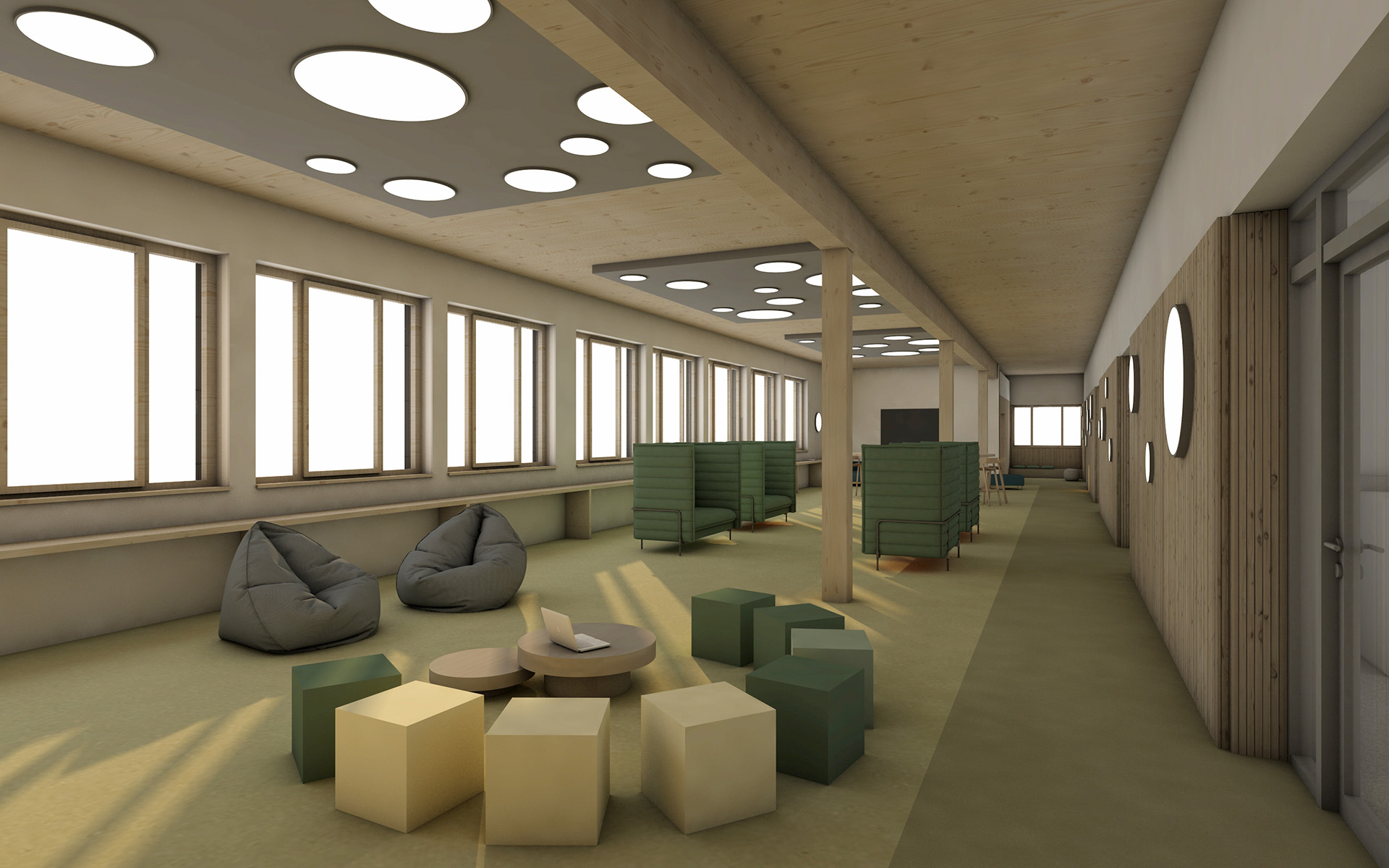 Die Aufstockung und Erweiterung der Privaten Realschule Wettringen folgt einem klaren Konzept: Sie schafft Raum für zukunftsweisende, freie Lernformen und sichert diese langfristig. Äußerlich fügt sich der Neubau bewusst zurückhaltend in den heterogenen Bestand ein und respektiert die unterschiedlichen Bauzeiten des Vorhandenen. Im Inneren entwickelt sich ein klarer, atmosphärisch angenehmer Kern: Die Holzrahmenbauweise, kombiniert mit einer sichtbaren Brettschichtholzdecke, prägt das Raumgefühl und sorgt für Wärme und Natürlichkeit. Weitere Farb- und Holzakzente im Innenraum setzen gezielt Betonungen, fördern das Wohlbefinden und unterstützen freies, selbstständiges Lernen sowie die individuelle Entwicklung der Schülerinnen und Schüler. Die Gestaltung verbindet Zurückhaltung im Äußeren mit einer einladenden, inspirierenden Lernlandschaft im Inneren. So entsteht ein Bau, der sowohl funktional als auch pädagogisch auf die Anforderungen moderner Schulentwicklung reagiert und langfristig die Qualität des Lernens sichert.