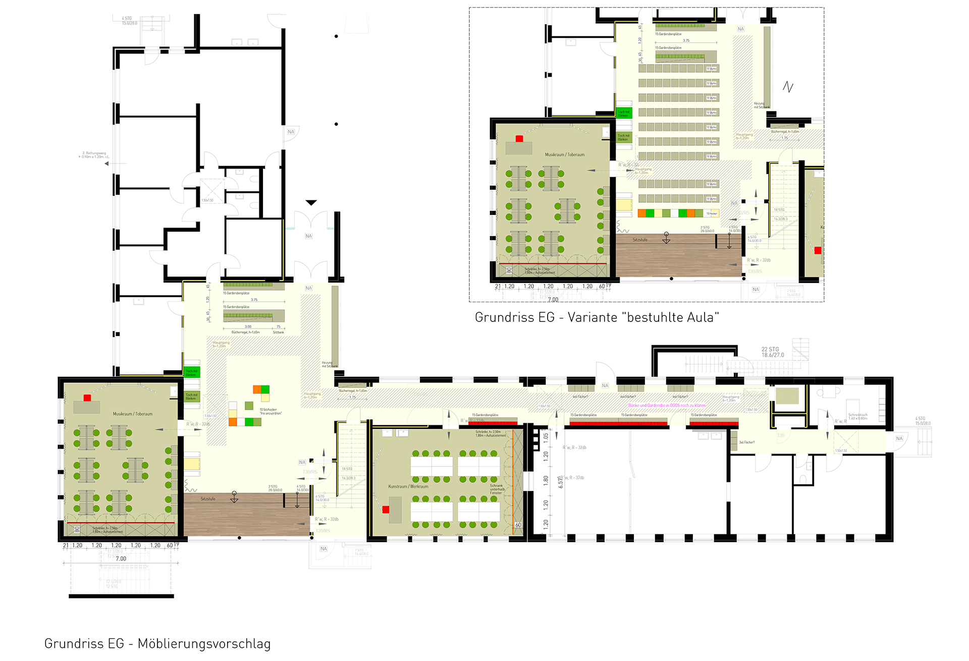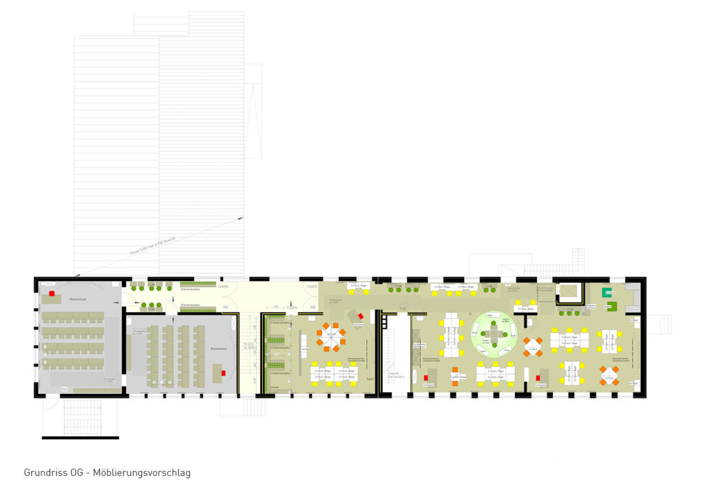 Der Umbau der St. Anna Grundschule in Dreierwalde ist ein hervorragendes Beispiel-Projekt, bei dem die bestehende Gebäudestruktur eines Gebäudes aus den 60er Jahren auf die aktuellen Nutzerbedürfnisse zur Realisierung des zeitgemäßen Lernkonzeptes der Grundschule angepasst wird. Der Entwurf zum neuen Raumkonzept verbindet hierzu das gesamte Obergeschoss der Grundschule zu zwei modern gestalteten Lernbereichen. Für das erfolgreiche Ausüben des jahrgangsübergreifenden Unterrichts der Kinder in der „flexiblen Schuleingangsphase“ steht das Von- und Miteinander lernen im Vordergrund. Hierzu werden im neuen Raumkonzept drei bestehende Klassenräume mit dem zugehörigen Schulflur verbunden und als offene Lernlandschaft für die Kinder der Klassen 1 + 2 konzipiert. Neben dem gemeinsamen Lernen wurde durch die Möglichkeit der flexiblen Möblierung auch gleichzeitig ein zusätzlicher Differenzierungsbereich ermöglicht. Die Klassen der Jahrgänge 3 und 4 erhalten separate Klassenräume, die wiederum durch den Flur als Rückzugsort für Lernaufgaben ergänzt. Im Zuge der Umbauarbeiten wird die gesamte Schule barrierefrei und multifunktional gestaltet, vorhandene „Hürden“ behoben und zudem ein Personenaufzug eingebaut wurde. Die Differenzierungsräume der Grundschule stellen das Bindeglied des Unterrichts am Vormittag mit der Nutzung der Räumlichkeiten im Nachmittag her. Die offene Herangehensweise der Nutzer ermöglicht es gleichzeitig auch, dass das Angebot der Möglichkeiten in der Nachmittagsbetreuung erweitert werden kann.
