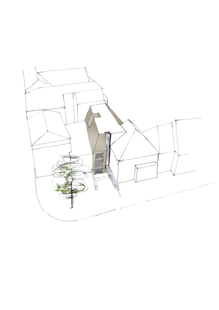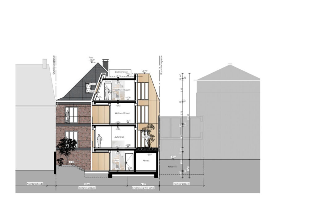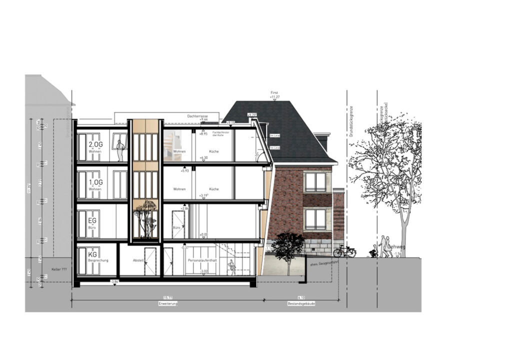Im Herzen des Kreuzviertels wird ein Stadthaus aus den 30er Jahren saniert und um einen modernen Baukörper erweitert. Das äußere Erscheinungsbild des hochwertigen Stadthauses wird weitestgehend erhalten und erfährt zudem noch eine Aufwertung durch neue Holzfenster und eine Schiefereindeckung des Walmdaches. Ergänzt wird das bestehende Gebäude durch einen monolithischen Baukörper mit einer Metallfassade und Dacheindeckung aus demselben metallischen Material. Hierbei stehen Bestand und Erweiterung nicht in Konkurrenz zueinander, sondern ergänzen sich in ihrer jeweilig eingeständigen Formensprache und lassen dem anderen Gebäudeteil weiterhin Raum zum Wirken. Das ursprünglich als Wohnhaus konzipierte Stadthaus wird im Rahmen der Baumaßnahme in den Rohbauzustand zurückversetzt und zusammen mit der Erweiterung energetisch auf einen aktuellen Gebäudeenergie-Standard gebracht. Die barrierefreie Erschließung des in Hochparterre gelegenen Bestandsgebäudes wird neben dem neuen großzügigen Treppenhaus über einen Personenaufzug sichergestellt. Insgesamt sind in dem Gebäudeensemble auf vier Ebenen zukünftig eine Büroeinheit (interne Erschließung über zwei Ebenen) und zwei hochwertige Wohneinheiten realisiert.